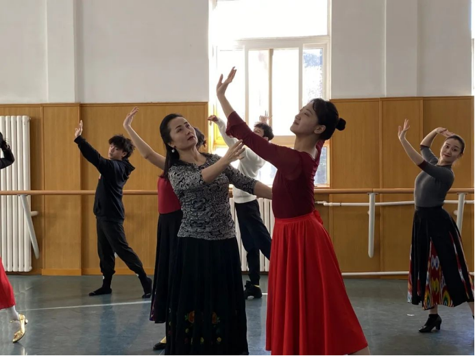 维吾尔族舞蹈课上,美哈阿依·喀依尔老师亲切、热情地向同学们讲述维吾尔族的历史以及维吾尔族舞蹈的风格特点,带领同学们体会维吾尔族舞蹈的韵味。