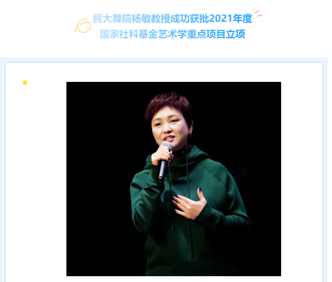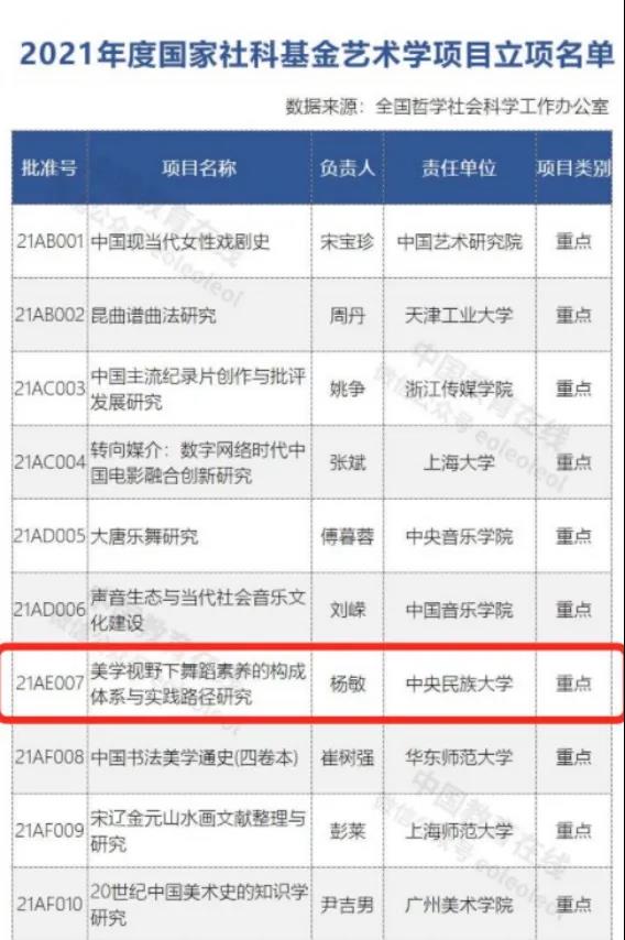 近日,文化和旅游部公布了2021年度国家社科基金艺术学重点项目立项名单。我院杨敏教授担任主持人申报的《美学视野下舞蹈素养的构成体系与实践路径研究》(项目号21AE007),经专家评审、社会公示,并报全国艺术科学规划领导小组批准,项目获得2021年度国家社科基金艺术学重点项目立项。