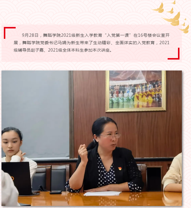 党员发展程序,马娟书记对党员发展的各项程序进行全面详细的讲述,并就入党申请书、思想汇报的书写要求进行了说明,耐心地解答了同学们的疑问,让同学们更加坚定了加入党组织的决心。马娟书记特别强调,民族英才班的设立,是为了培养更多的少数民族舞蹈专业人才,体现了党和国家对少数民族的关心与爱护,同学们要感党恩,听党话,跟党走,坚定文化自信,不断努力学习好专业本领,创作和表演更多优秀文艺作品,讴歌新时代,唱响主旋律,以实际行动来回报党和国家的培育,努力成为维护民族团结的社会主义事业合格建设者和接班人。