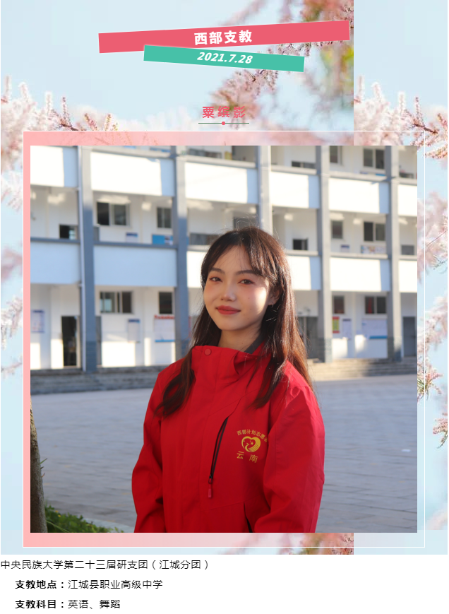 将大爱镌刻大山,将奉献印在边疆。身体力行勤浇灌,支教花开别样红。支教工作是爱心的传递,是知识的传递,是力量的传递。虽然我的力量是薄弱的,但是我们整个全国项目研支团的力量凝聚起来是强大的。我相信国家,相信奋斗在边疆,奋斗在贫困地区的志愿者们。我将始终牢记研支团神圣使命,不忘初心,不负韶华,努力拼搏,勇往直前,将继续坚持实践“美美与共,知行合一”。请党放心,强国有我们!