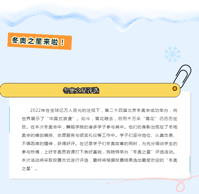燃情冰雪盛会,诠释奥运精神,我们以时代新青年的使命担当,有幸的参与了冬奥的闭幕式环节,践行了“强国有我”的誓言,为冬奥盛会奉献了青春力量。感谢国家和学校给予我们此次机会,用“折柳寄情”等方式把中国的传统文化艺术及浪漫传递到全世界,心中的自豪感油然而生,双奥之城“北京”给我们留下了美好的记忆。当嘹亮的国歌在国家体育场响起的时候,身为中华儿女,深深地感受到了祖国的伟大,繁荣昌盛。那一刻我为我们的祖国而骄傲自豪。北京冬奥会虽已落幕,但奥运精神常在,那朵寓意“世界大同,天下一家”的雪花将永驻在我们心头!一朵雪花的故事结束了,但我们还是要像折柳里的绿色光束一样,光束升起,一切都要向前看。我爱我的祖国,我爱我们的“冬奥大家庭”,让我们一起向未来。