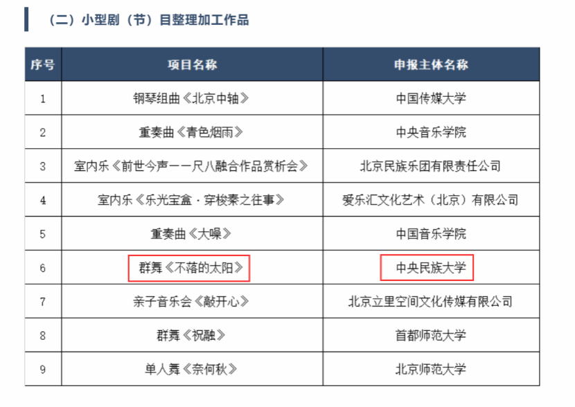 2022年12月9日,北京文化艺术传承发展中心(北京文化艺术基金管理中心)发布了2022年度北京文化艺术基金资助项目名单,经专家严格评审,我校申报的群舞《不落的太阳》成功入选为:小型剧(节)目整理加工作品的资助项目。