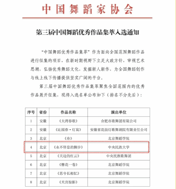 民大舞院在此次第三届中国舞蹈优秀作品集萃评选中的优异表现,既是对我们过往成绩的肯定,更是对我院未来发展的激励。学院将以此为契机,继续深耕舞蹈艺术领域,不断挖掘民族文化内涵,鼓励师生创作出更多更好的优秀作品。在未来的日子里,将会在舞蹈艺术的道路上继续砥砺前行,为我国舞蹈事业的发展贡献更多智慧与力量,让更多璀璨的舞蹈之星从这里升起,闪耀在世界舞蹈艺术的天空。