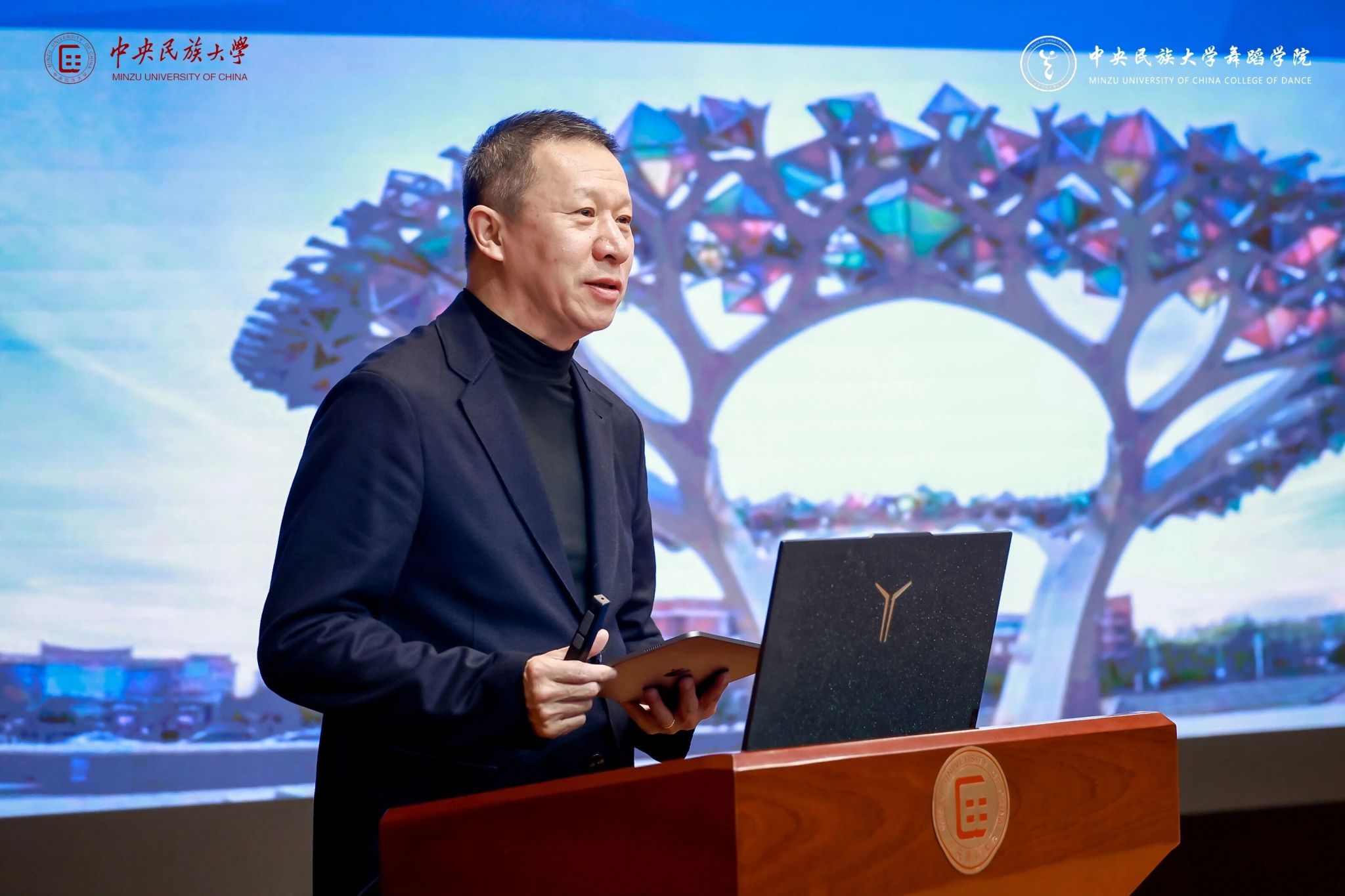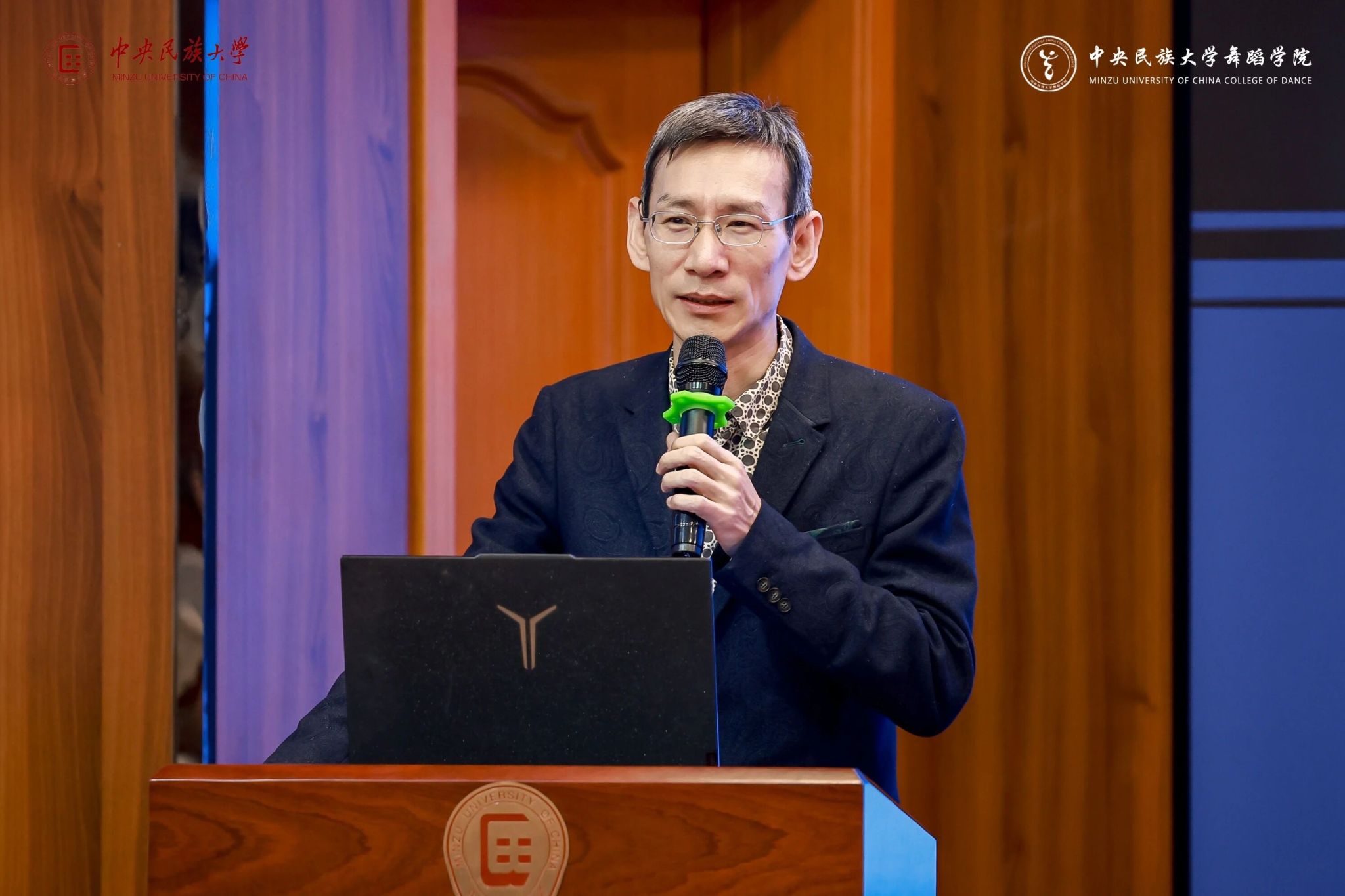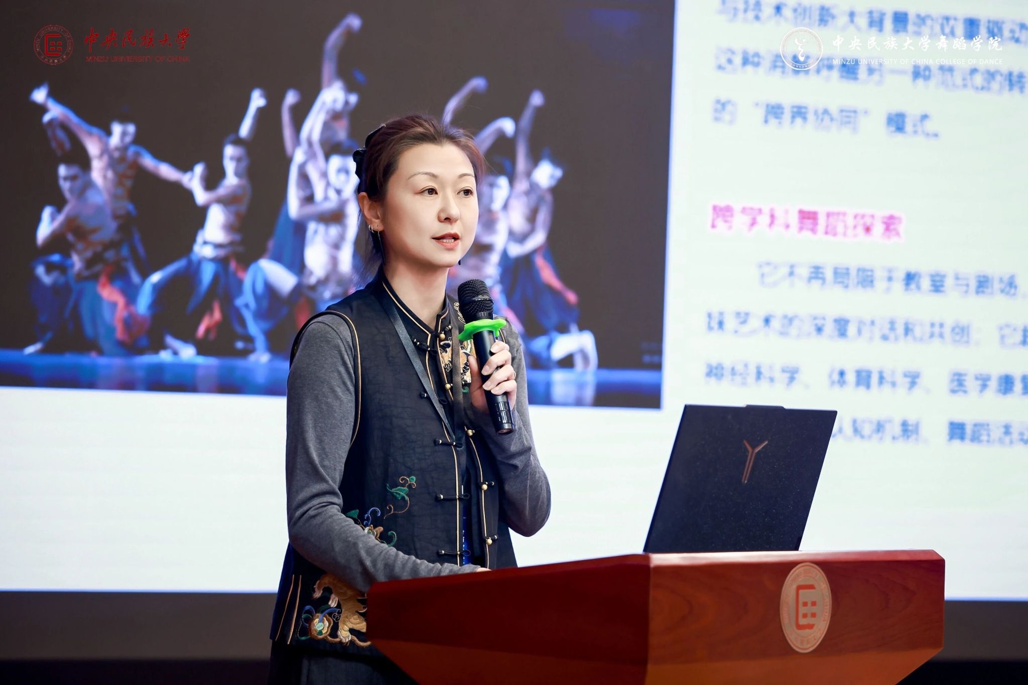 党委副书记、院长、硕士研究生导师李琦教授以《跨界协同·互通互融:舞蹈学科发展新生态》为主题进行分享,提出在全球学术视野和技术创新大背景的双重驱动下,在艺术与科学、人文与技术间的传统界限逐渐消解的同时,唤醒了另一种范式的转变,即开放、动态的跨界协同模式。与此同时,技术赋能成为构建舞蹈艺术新生态的关键“催化剂”。数字技术不仅革新创作逻辑与呈现形态,还推动传播与教育层面的革新。在西北民族大学对敦煌舞教学与研究的尝试中,跨界融通为有效践行铸牢中华民族共同体意识开辟了新的、具有影响力的实践路径。同时,构建新生态的核心要素包括理念重塑、人才培养模式创新、平台与机制建设及伦理与美学反思等,并强调舞蹈学科应注重“人文为体、科技为用”的深度融合,借助跨界对话凸显本土文化的独特价值与当代活力,并通过艺术与科技的协同创新,回应人类共同的情感诉求和精神挑战。