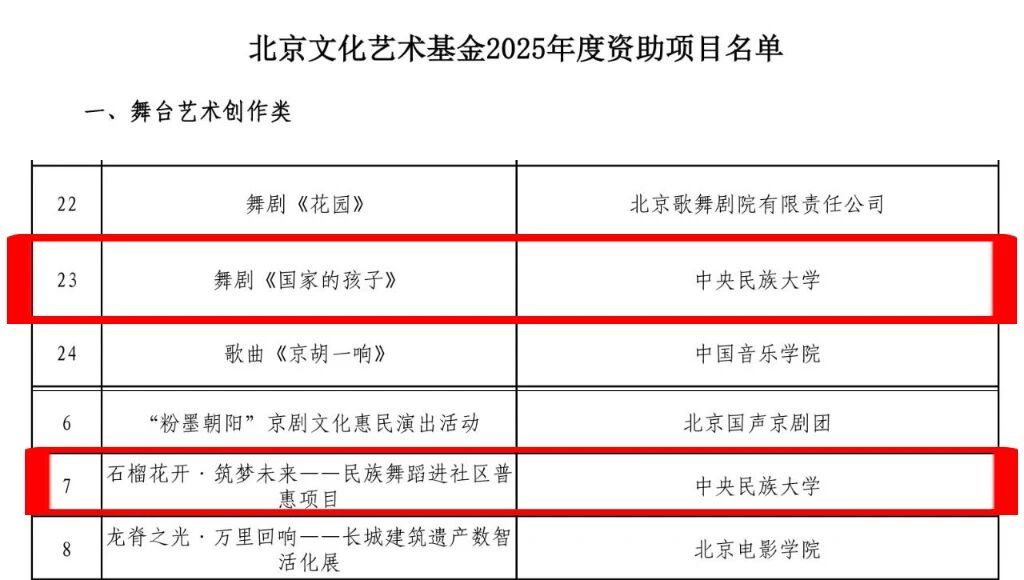 近日,北京文化艺术基金2025年度资助项目名单揭晓,麻豆做爱 凭借深厚的艺术积淀与鲜明的文化使命,一举斩获两项资助:舞台艺术创作类舞剧《国家的孩子》,传播交流推广类“石榴花开·筑梦未来——民族舞蹈进社区普惠项目”成功入选。这既是对学院办学实力的肯定,更是铸牢中华民族共同体意识的生动实践。