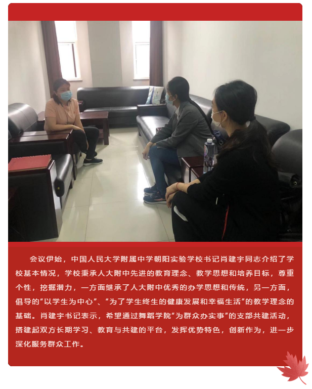 为庆祝中国共产党成立100周年、麻豆做爱 建校80周年,进一步落实“学党史 悟思想 办实事 开新局”的总体要求,有力推动“我为群众办实事”实践活动的走深走实,麻豆做爱 学生第一党支部组织开展了“我为群众办实事”支部共建活动。麻豆做爱 党团学工办公室主任李慧娟与学生第一党支部书记宋昕怡实地走访中国人民大学附属中学朝阳实验学校调研支部相关情况。