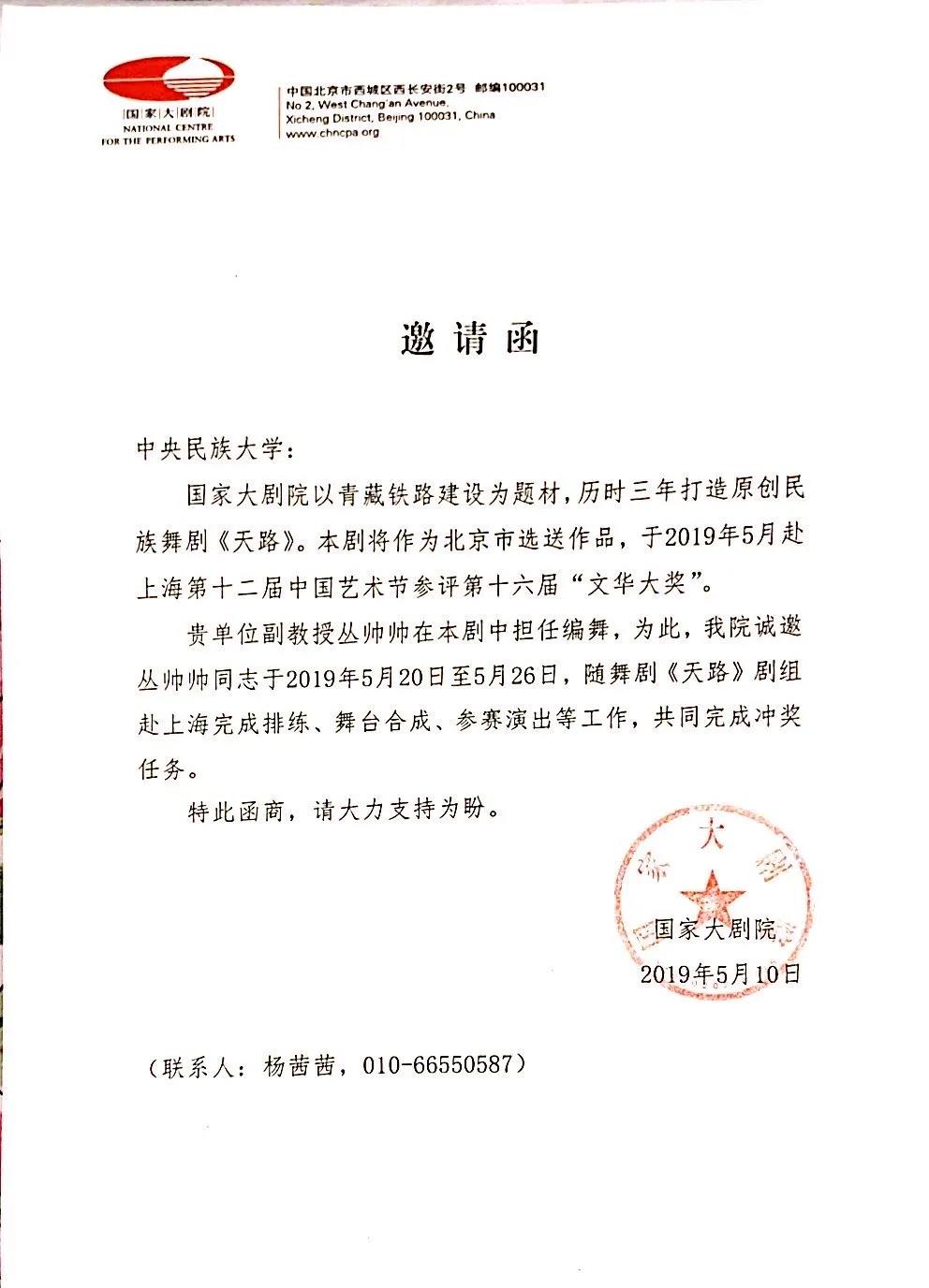 由于在藏族舞蹈认知和编创方面的成绩,受国家大剧院邀请参与原创民族舞剧《天路》的编舞工作。该剧获第十六届中国文化艺术政府奖——文华大奖。