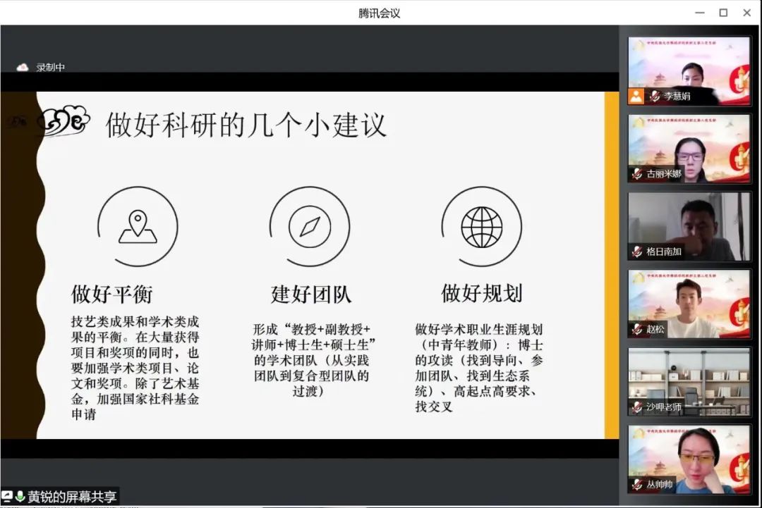 党委通过腾讯视频会议形式组织开展了理论学习中心组扩大会议,邀请学校科研处处长黄锐教授为学院全体教职工讲授了以“艺术类学科成果转化及科研创新—科研管理者的视角”为主题的专题讲座。会议由学院党委书记马娟主持。