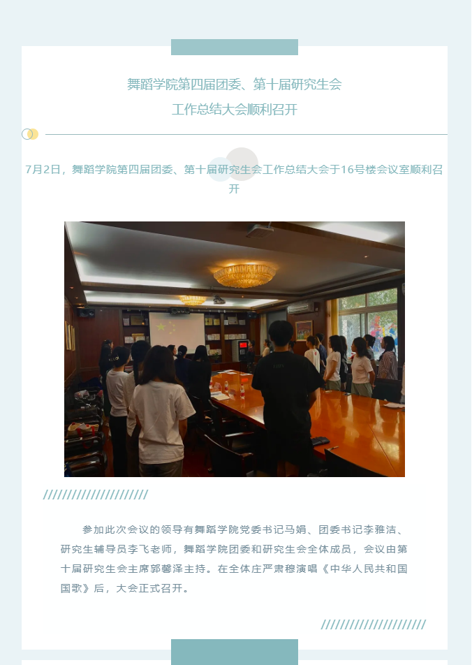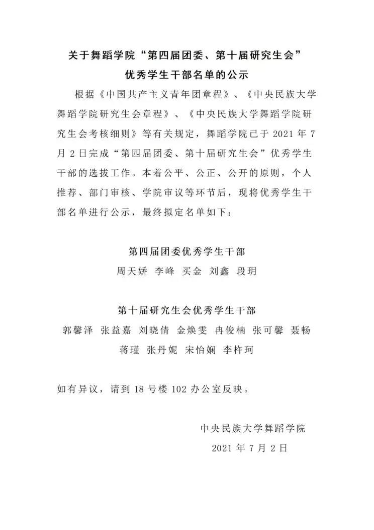 已于2021年7月2日完成“第四届团委、第十届研究生会”优秀学生干部的选拔工作。本着公平、公正、公开的原则,个人推荐、部门审核、学院审议等环节后,最终拟定优秀学生干部名单。