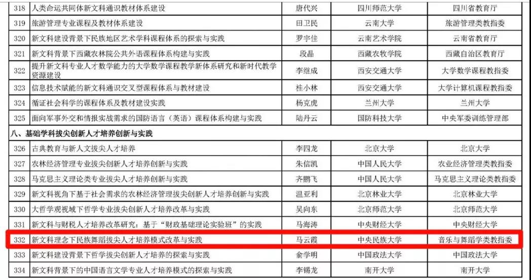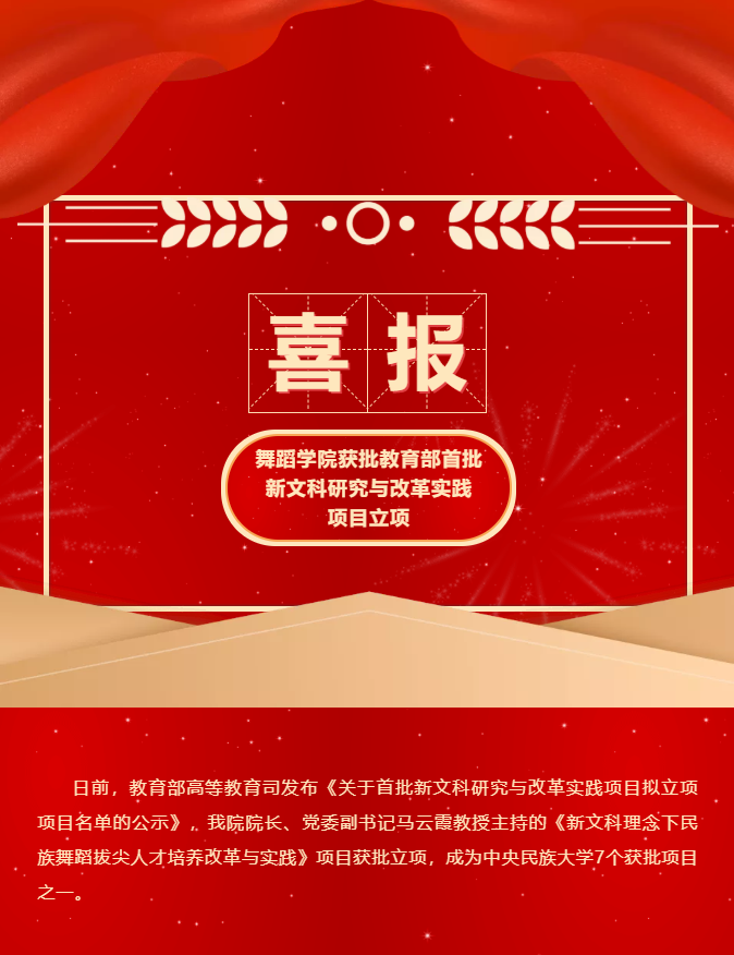 新文科建设对于推动文科教育创新发展,构建以育人育才为中心的社会科学发展新格局,加快培养新时代文科人才,提升国家文化软实力具有重要意义。《新文科理念下民族舞蹈拔尖人才培养改革与实践》项目基于我院“尖子人才培养计划”的实践,进一步集聚协同优质资源,创新人才培养模式。该项目紧密结合我院办学定位与优势特色,以舞蹈表演国家级一流本科专业建设点为支撑,通过兼融并通大众化专业教育与个性化精英教育,以学生为中心,以需求为导向,积极探索多元化的民族舞蹈人才培养新标准、新模式、新方案、新体系,实现质量提升与项目实施之间的协同发展。