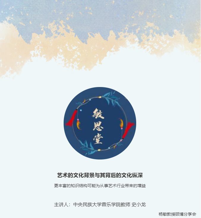 音乐学院史小龙老师主讲,分享主题为“艺术的文化背景与其背后的文化纵深——更丰富的知识结构可能为从事艺术行业带来的增益”。此次分享旨在为同学们树立正确的文化站位、明确文化担当,深化对舞蹈学科乃至艺术门类的理解与认识,进一步拓展学生的创新研究视野。