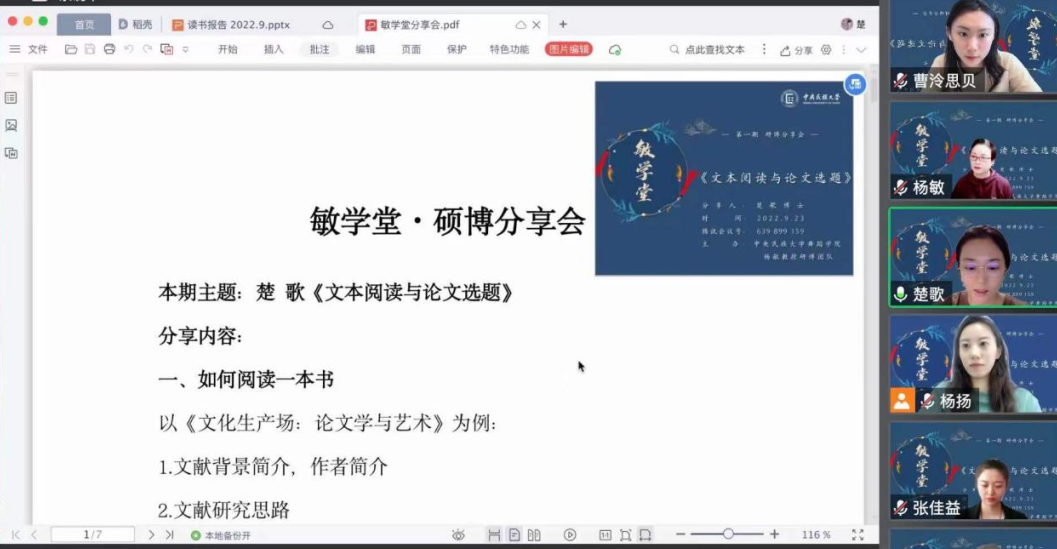 副院长杨敏教授组织研究生团队召开了本学期第一次“敏学堂·硕博分享会”。本次分享会由我院2019级博士研究生楚歌主讲,主题为《文本阅读与论文选题》,此次硕博分享会麻豆做爱
