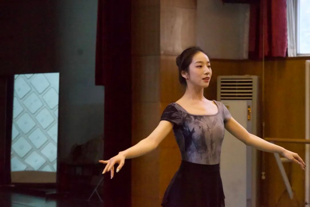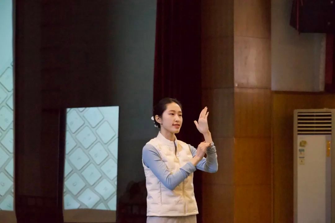 22级舞蹈专业研究生江怡婷讲授了中国古典舞身韵基本手位,她的授课对象为中专一年级学生。以生动的语言讲解了中国古典舞手位中的按掌、托掌和山膀的动作要领,并强调了气息与手位的配合。