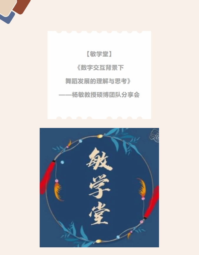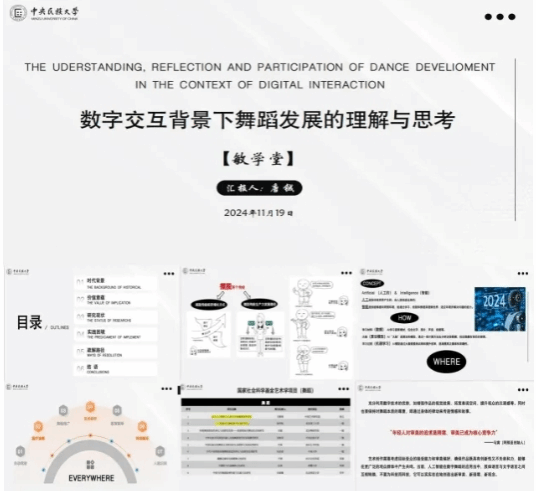 11月19日中午,由杨敏教授组织硕博团队召开了“敏学堂·硕博分享会”。本次分享会由我院 2024 级博士研究生唐铖主讲,主题为《数字交互背景下舞蹈发展的理解与思考》。