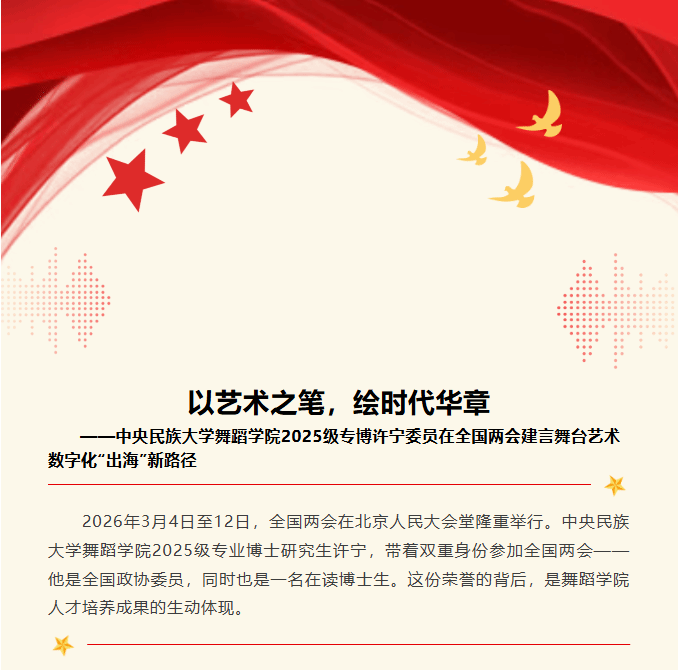 的深厚滋养。作为我国民族舞蹈人才培养的重镇,学院始终鼓励学子在深耕专业的同时,勇担时代使命。许宁从学生到委员的成长轨迹,正是这一育人理念的生动缩影。