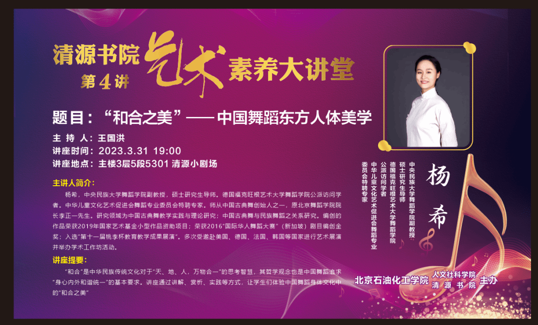 3月31日,受北京石油化工学院人文社科学院的邀请,我院硕士生导师杨希副教授,带领20级表演女班的徐雅璇、张京豫和19级表演男班的赵俊杰三位同学,参加了该院举办的艺术素养大讲堂活动,讲授主题为“和合之美”——中国舞蹈东方人体美学。